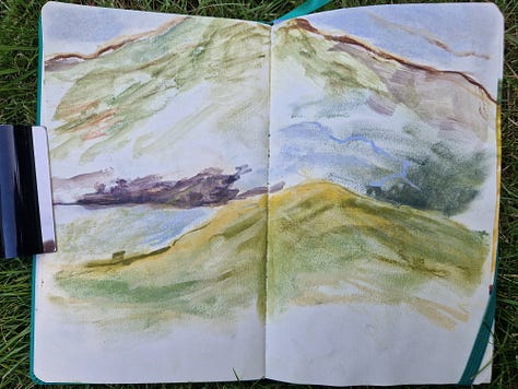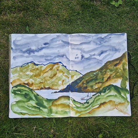 Normally, I paint a landscape once, learn from it and move on to the next place. However, I really enjoyed sitting in the same place every day and painting the same view again and again. Each time having a different focus or intention for the piece. Maybe it was a colour study, maybe playing with the movement of the hills and the contrast with the loch. And finally, adding some narrative and eventually capturing the ferry that passed by multiple times per day. I learnt a lot from this constant repetition and hope to continue doing this in June.