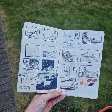So far, there are no final images, though I have taken a lot of reference photos and planned the story. But you can see a few of the practice drawings and thumbnails.